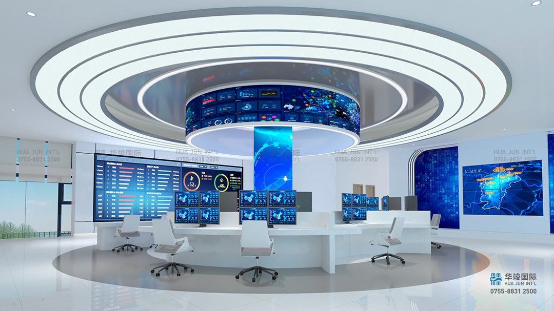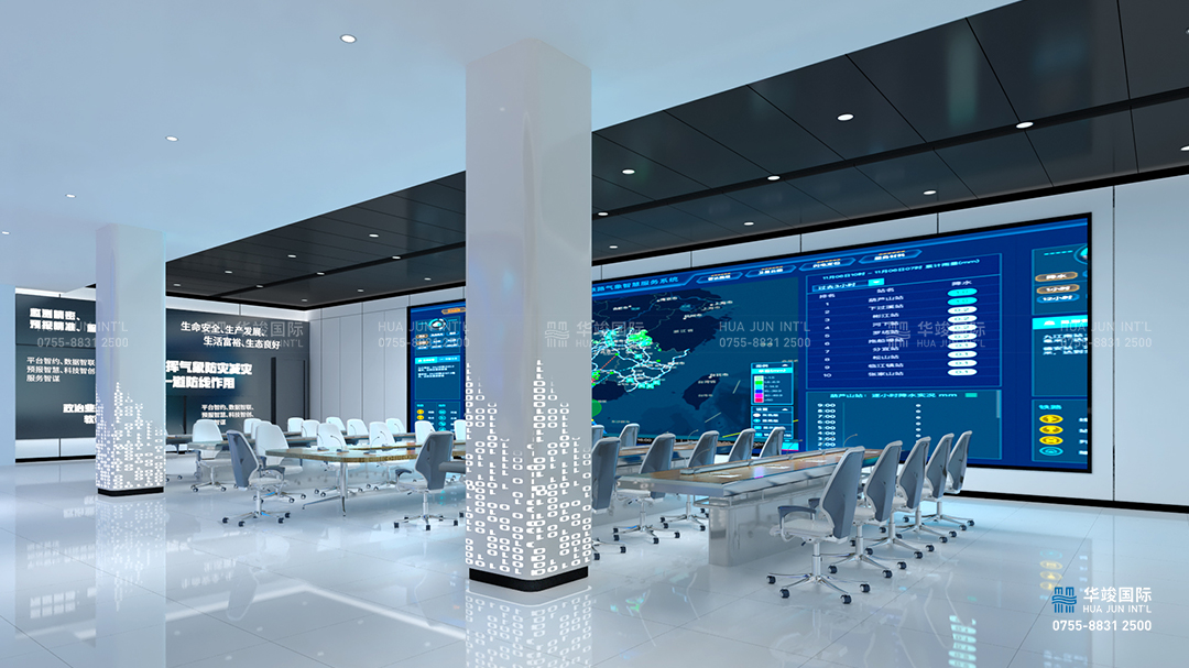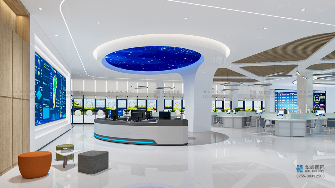 以現代簡約的空間構建手法,以氣象和數據為空間元素,打造簡約大氣,重點突出的前廳接待空間。頂部天花用氣象的 LOGO勾勒出整體天花的設計感,墻面發光的數據表達大數據的元素,同步中間光效層層包裹中嵌入一塊LED大屏,播放江西智氣象空間全面的視頻介紹片。有時候也可以作為歡迎屏,切換歡迎詞來使用。