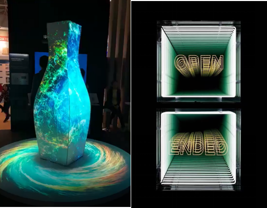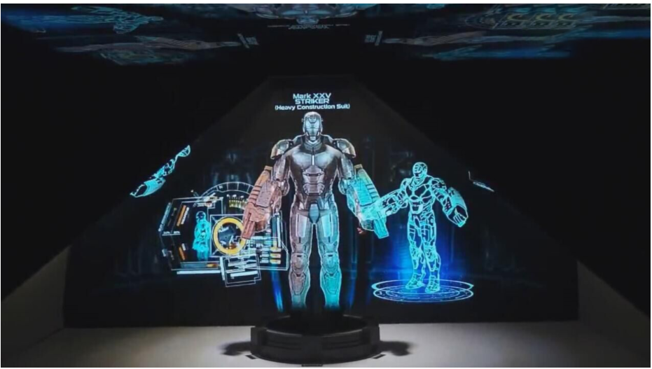 全息成像:采用投影儀或其他顯示方法,將光源折射45度成像在幻影成像膜上,稱之為全息投影。該技術(shù)可以使立體影像不借助任何屏幕或介質(zhì)而直接懸浮在設(shè)備外的自由空間,可以實現(xiàn)270°或者360°任意角度看都是三維影像展現(xiàn)效果,觀眾的視線能從錐形空間里看到自由漂浮的圖像。